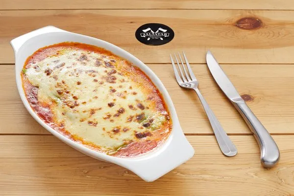 Layers of spinach lasagna, topped with classic meat ragu, mozzarella & bechamel sauce