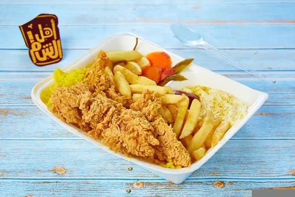Served with garlic dip, pickles, fries, bread & rice