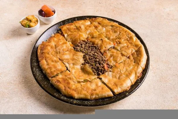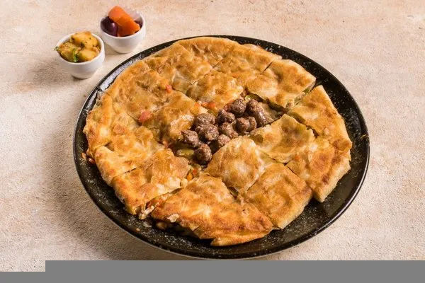 Minced meat, pepper, tomato, olives, mozzarella, roomi cheese