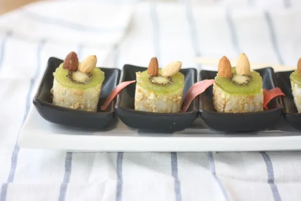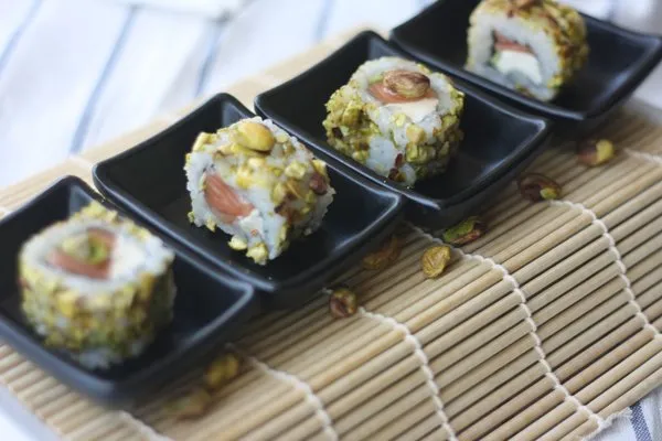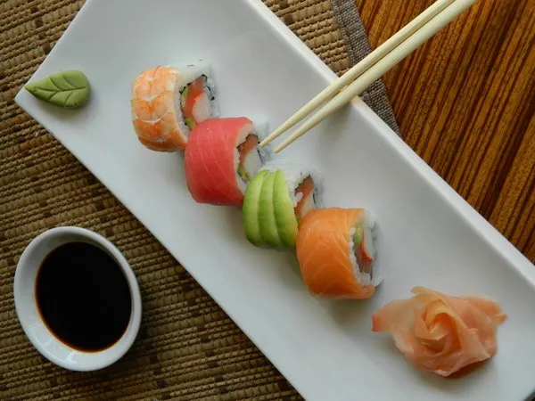Slice of salmon, avocado, cream cheese, teriyaki sauce and sesame