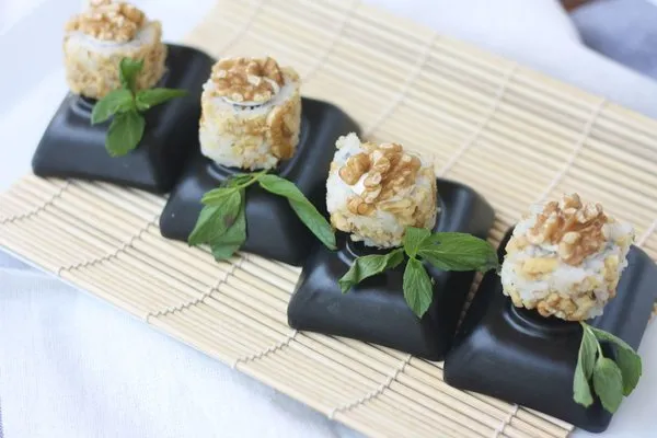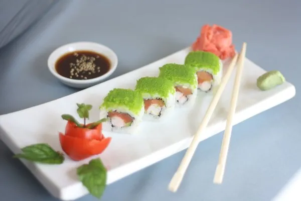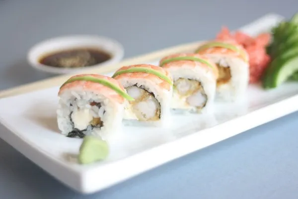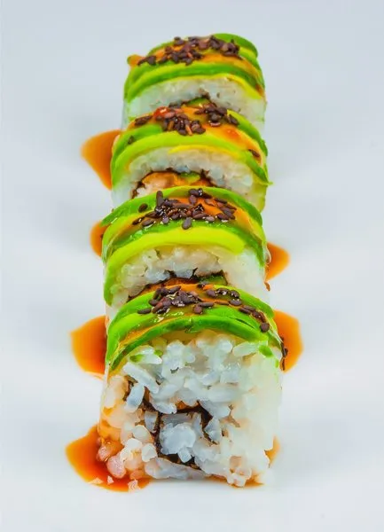 Eel, avocado, teriyaki sauce, covered with avocado slice and sesame