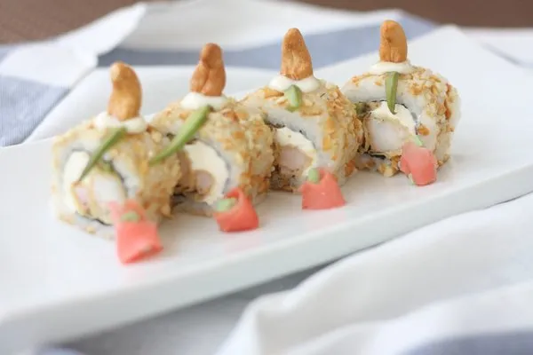 Salmon, shrimp, avocado, cucumber, seaweed, rice wrapped in fried tempura