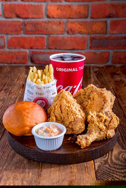 2 crispy chicken pieces with fries, bread, lettuce, coleslaw and coca cola