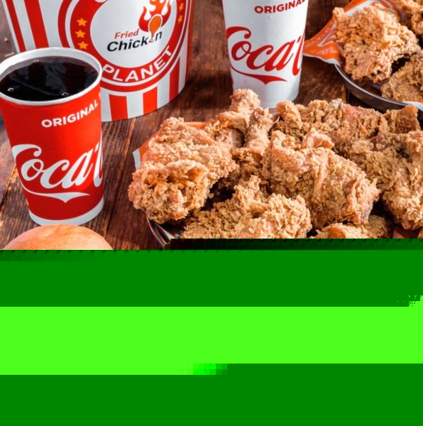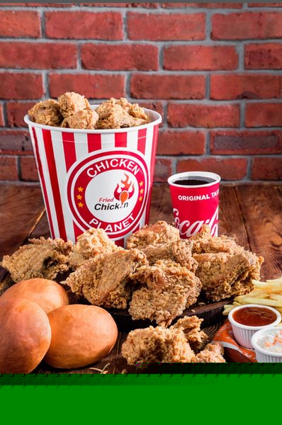Fried chicken pieces with Chicken Planet special spices, large fries, large coleslaw salad, bread and soft drink liter