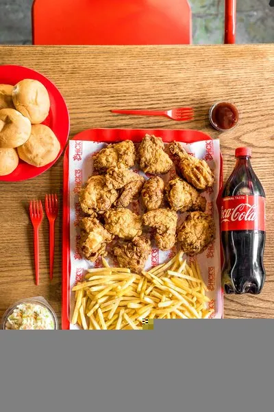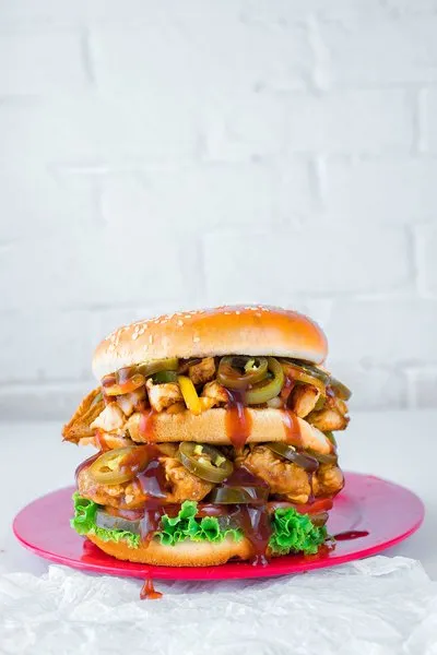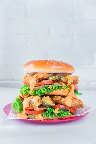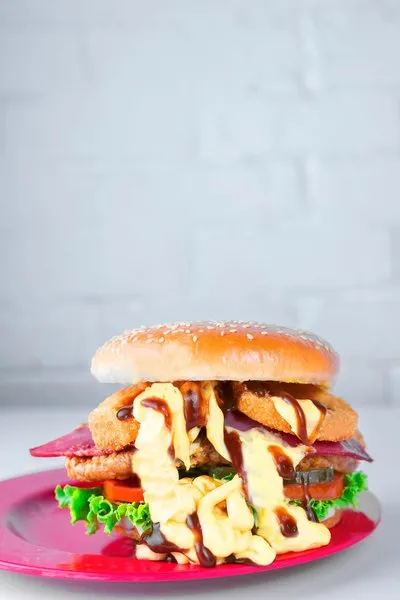 Crispy chicken, lettuce, tomatoes, pickled cucumber, mayonnaise, onion rings, smoked beef, BBQ sauce and cheese sauce