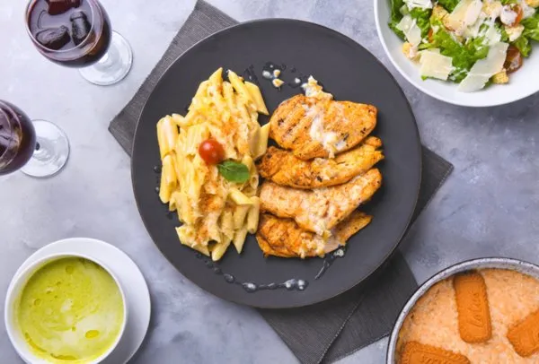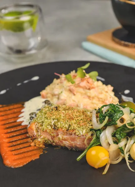 Ramadan drinks, soup, salad, grilled salmon with risotto, roca, sauteed vegetables, onion, dill-caper cream sauce