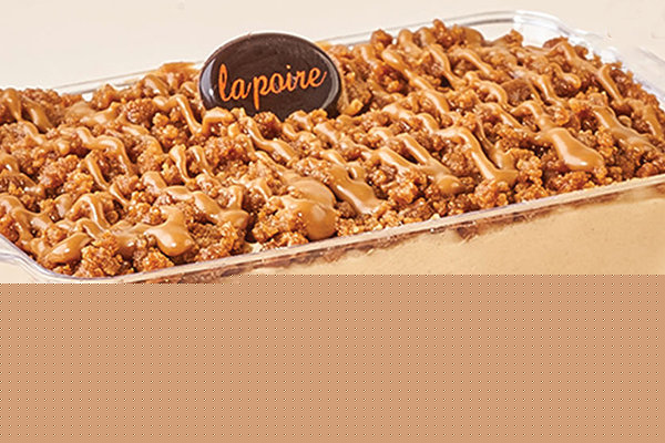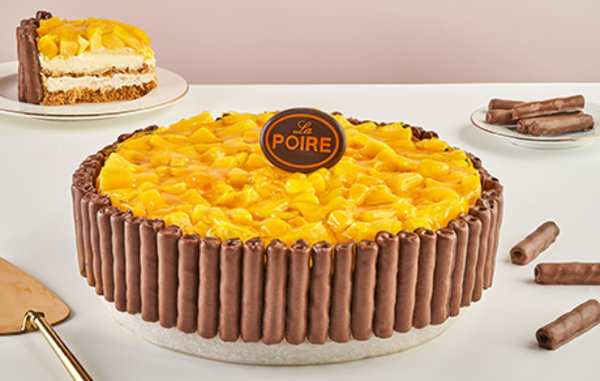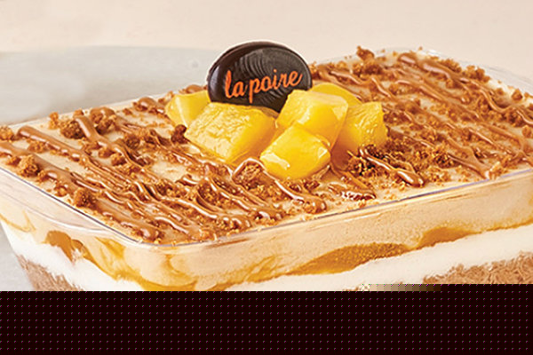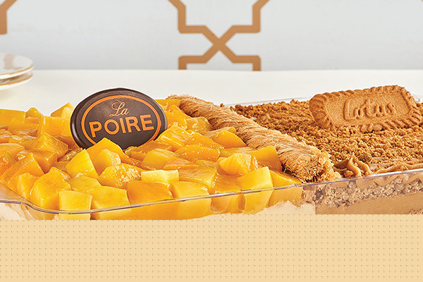 Layer of La Poire konafa, 1/2 lotus cream with lotus biscuits, 1/2 mango with mango cream and mango pieces
