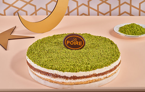 Layer of La Poire konafa othmanlya stuffed with La Poire cream garnished with pistachio, almond, pistachio croquant