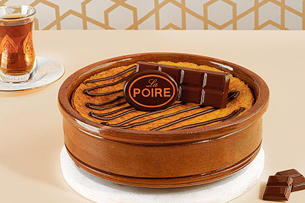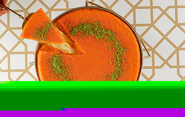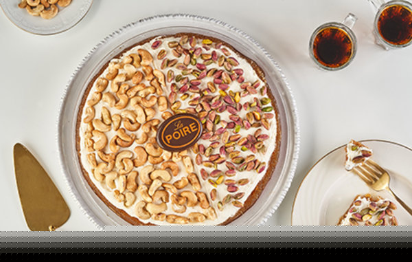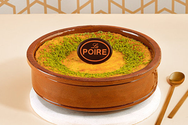 Layer of basbousa with baladi samna, white chocolate, La Poire baklava, garnished with crushed pistachio