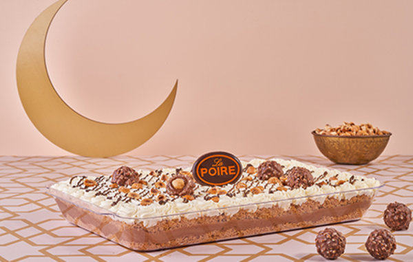 La Poire konafa othmanlya with baladi samna stuffed with ferrero rocher cream, layer of light white chocolate, garnished caramelized hazelnuts, ferrero rocher chocolate