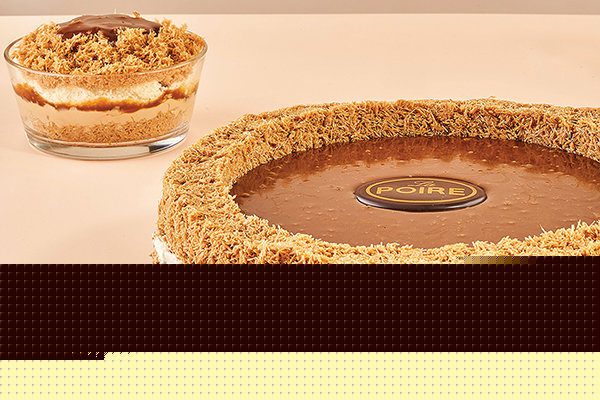 Layer of La Poire konafa, 1/2 lotus cream with lotus biscuits, 1/2 nutella fudge, caramel cream, pieces of fudge cake covered with nutella garnished with layer of nutella, caramelized hazelnuts, maltesers chocolate