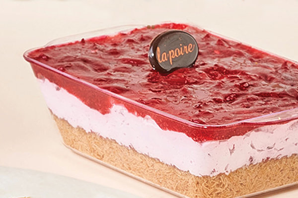Layer of La Poire konafa othmanlya stuffed with yogurt mousse cream, cherry