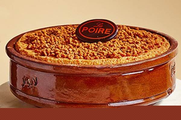 Layer of vanilla sable, La Poire eish saraya, fresh cream, crushed pistachio
