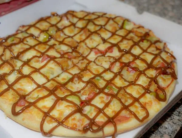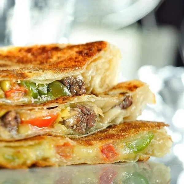 Stuffed inside with meat, sojouk or liver and from outside red sauce, mozzarella, colored pepper and olive