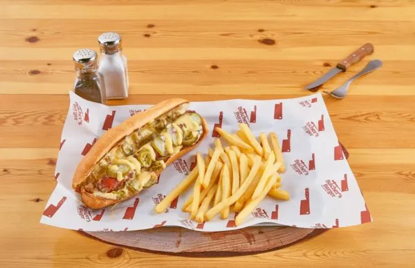 Grilled hot dog, cheese sauce, chili con carne, jalapenos, fresh onions, pickled cucumber and hot sriracha mayonnaise