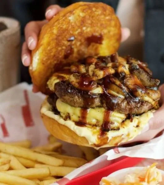 300 gm, double cheese, beef bacon, caramelized onions, jalapenos, lettuce, pickles, garlic mayo