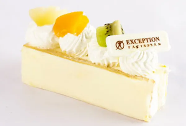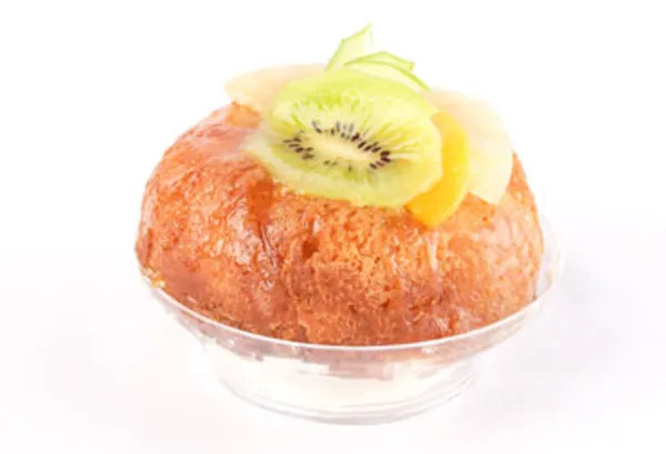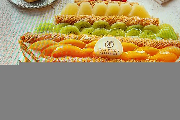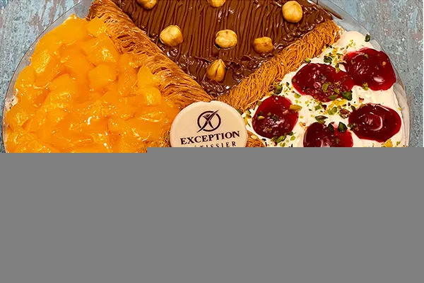 Konafa with cream and mixed fruits, kiwi, peach, strawberry, pineapple, cherry