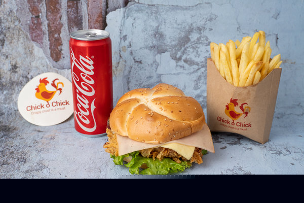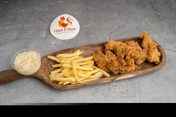 4 pieces fried chicken, French fries, coleslaw salad or garlic dip, bun