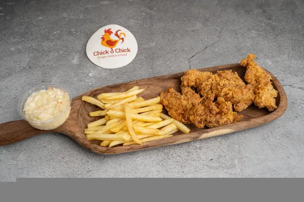 3 pieces fried chicken, French fries, coleslaw salad or garlic dip, bun