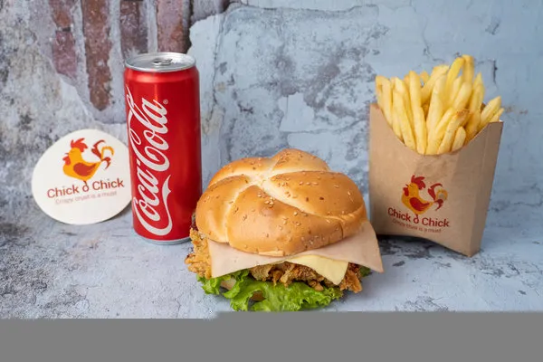 Regular cheese chicken burger sandwich served with fries and drink