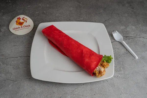 Chicken strips, lettuce, tomato, chilli sauce, cocktail sauce in tortilla bread with tomato