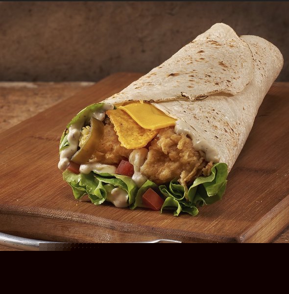 2 crispy chicken breast strips, tomatoes, doritos, jalapeno cheese, mayonnaise with pepper, lettuce and tortilla bread