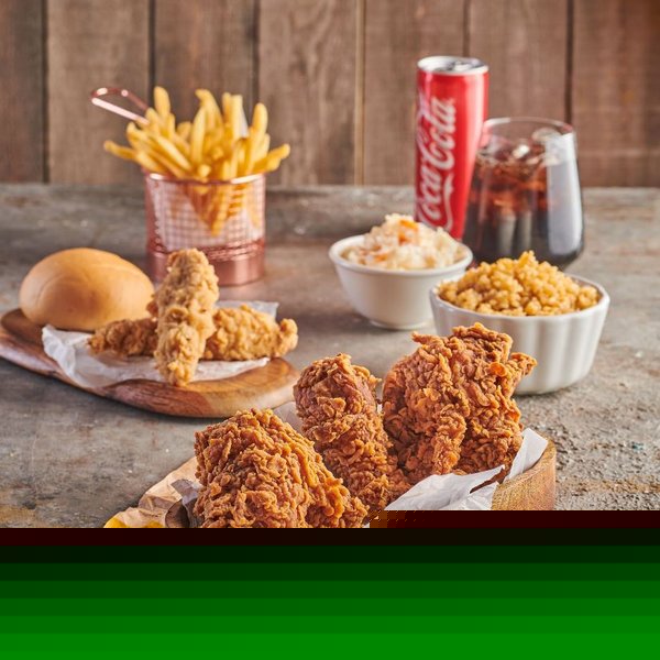 8 chicken pieces, 8 crispy strips pieces, 4 arizo, family fries, large coleslaw, 4 buns, large garlic dip and drink liter