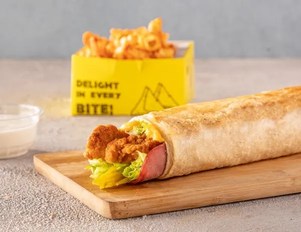 Spicy Chicken StripsChicken strips pieces, iceberg lettuce, pickled cucumber, mayonnaise, garlic dip, fries |