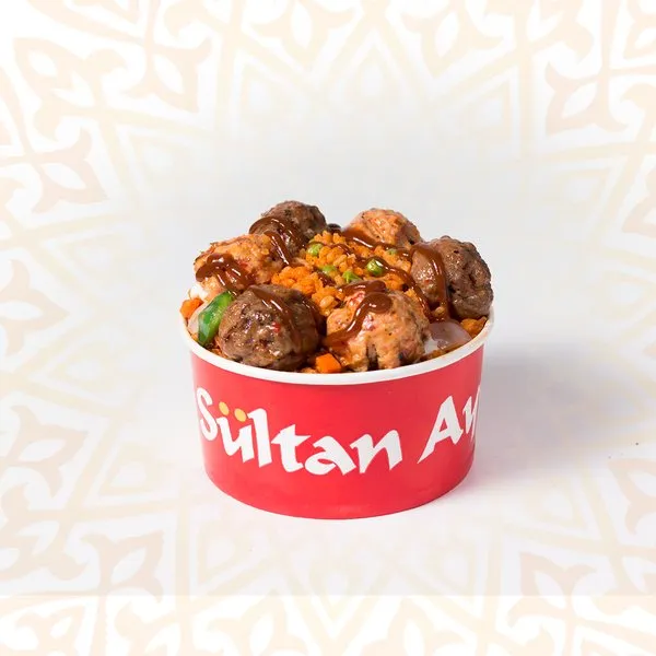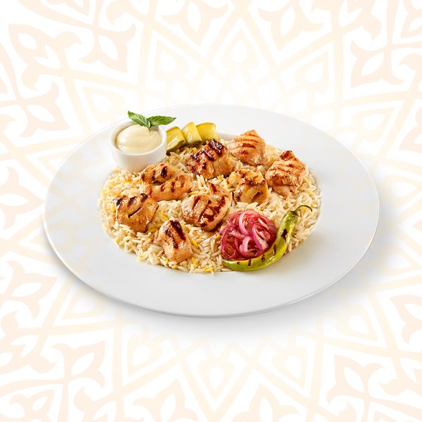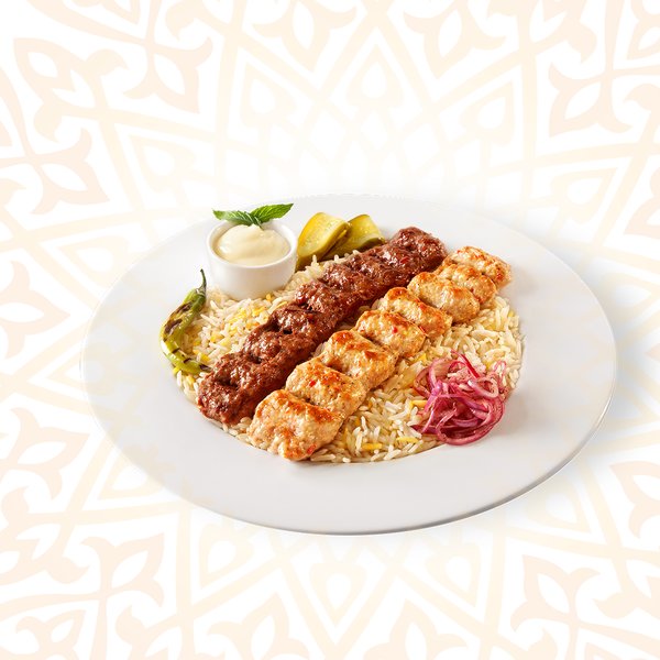 RozoShawerma or kebab, Egyptian red rice with peas and carrot, BBQ sauce, garlic dip |