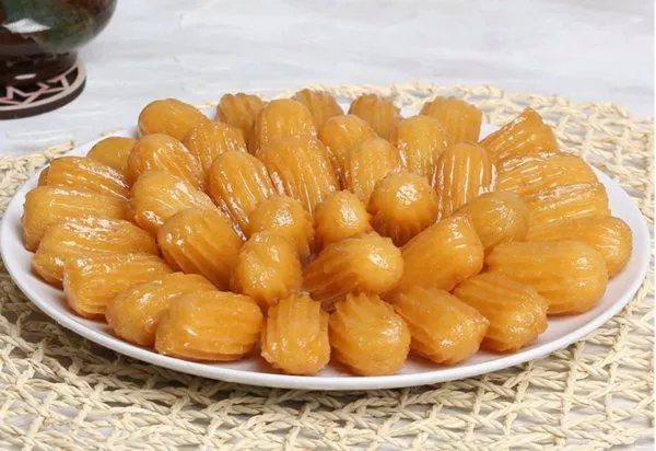Piece of papaz cake with orange syrup, cream and apricot jam