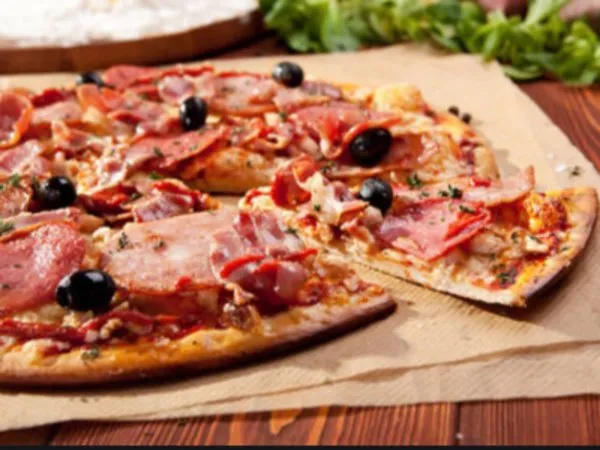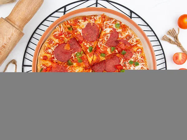 Pepperoni, beef bacon, beef salami, mozzarella cheese, parmesan cheese, basil, and tomato sauce
