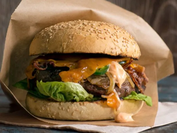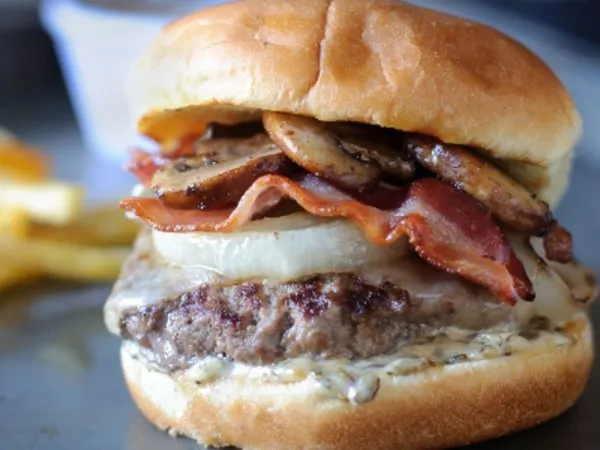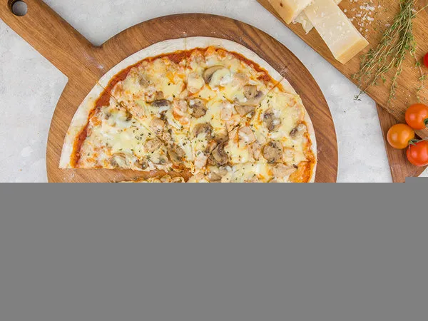Beef bacon, mushrooms, basil, tomato sauce and mozzarella cheese