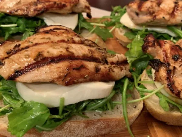 Chicken, olives, onions, tomato sauce and mozzarella cheese
