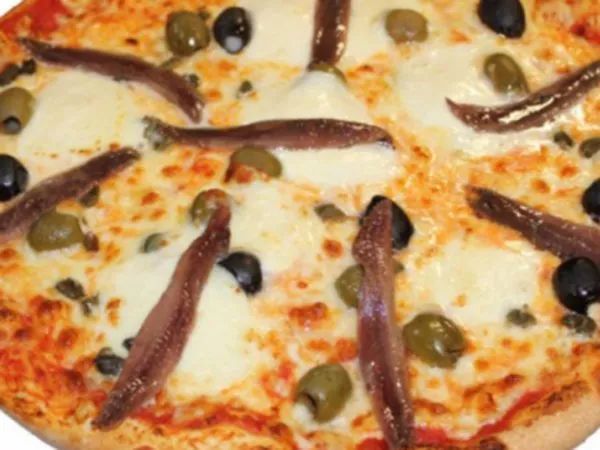 Anchovies, capers, olives, basil, tomato sauce and mozzarella cheese