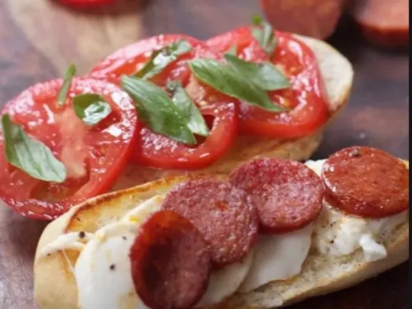 Pepperoni, basil, mozzarella cheese and tomato sauce