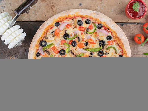 Mushroom, olives, basil, tomato sauce and mozzarella cheese