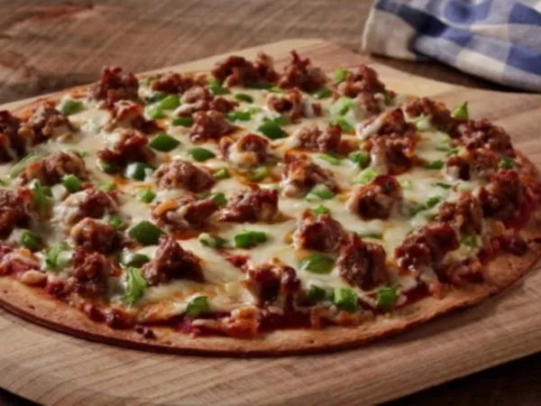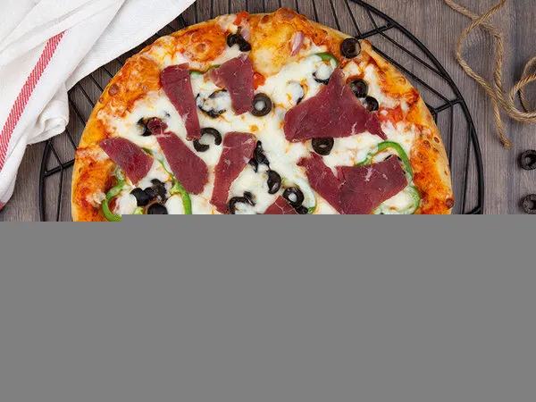 Oriental sojouk, tomato sauce , mozzarella cheese, green pepper, olives and parmesan Cheese