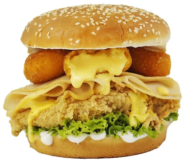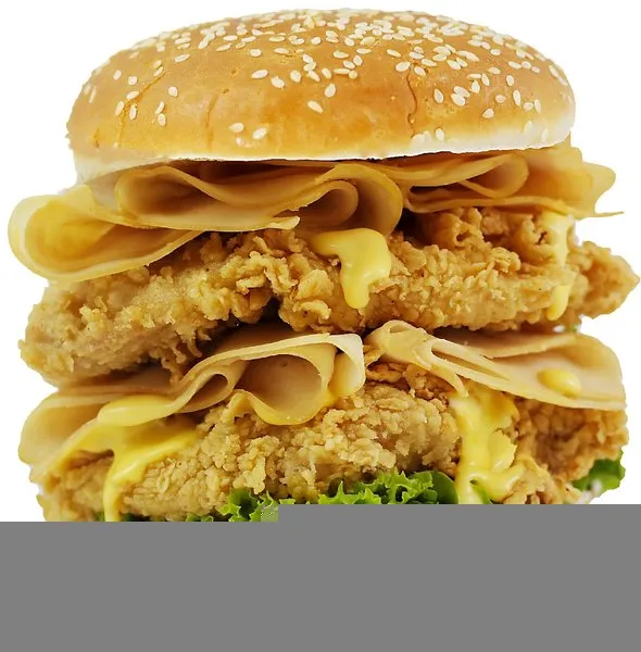 Chicken breasts, onion rings, BBQ sauce, cheese, turkey, lettuce, mayonnaise and bread with sesame