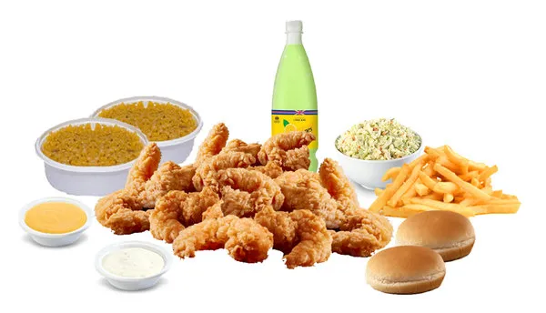 25 shrimp pieces, fries, 3 rice, 3 sauces of your choice, kaiser, coleslaw and family schweppes lemon mint