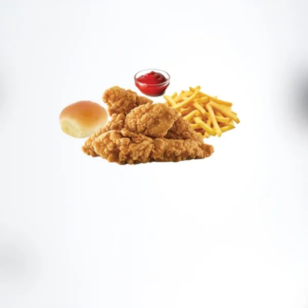 3 chicken pieces served with fries, bread and ketchup