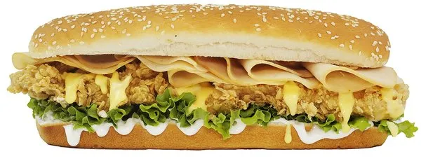 Chicken breasts, mozzarella sticks, ranch sauce, cheese, turkey, lettuce, mayonnaise and bread with sesame