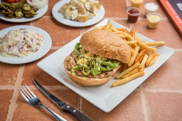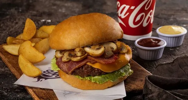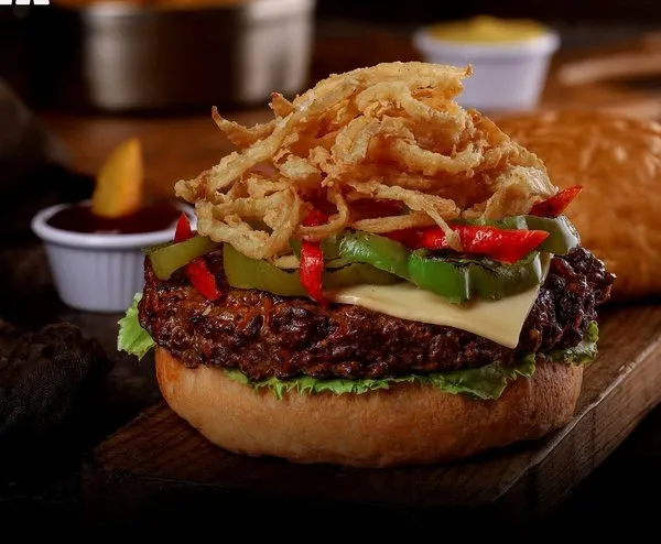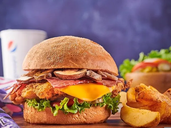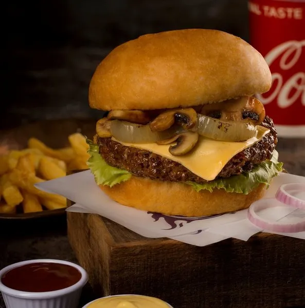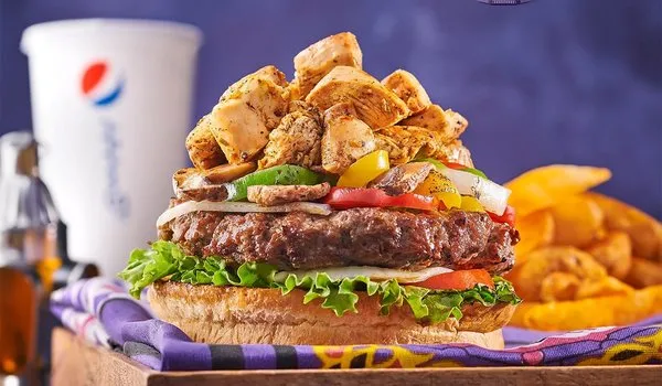 Enjoy the breast burger patty and Wild chicken cubes, grilled onions, fresh mushroom and bell pepper on top