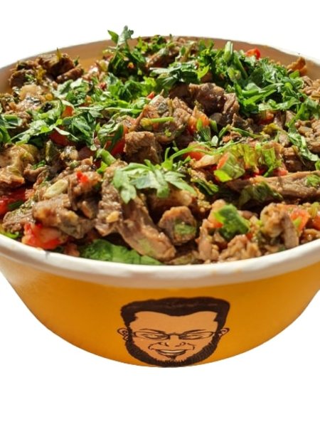 Meat shawerma slices, onion, tomatoes, parsley and tehina