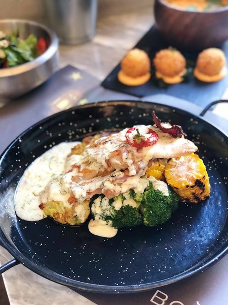 Slow-cooked marinated center cut premium fillet, tomato, cucumber, onion, chili, mixed leaves and cracked peanuts, served with lime creamy cilantro dressing