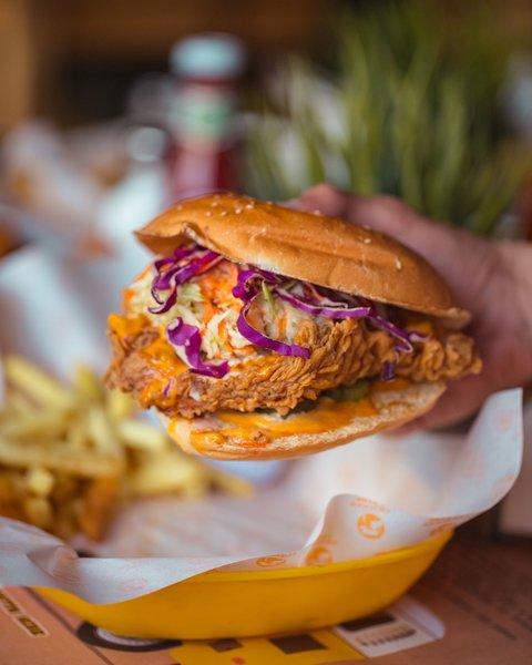 Golden fried breast with a drizzle of tabasco honey mustard and topped with cabbage slaw and pickles