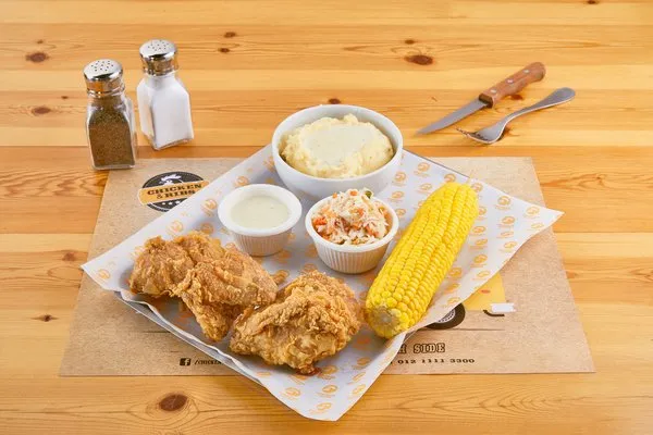 3 pieces fried chicken, mashed potato, gravy, corn on the cob