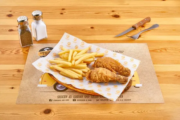2 fried drumsticks, served with fries