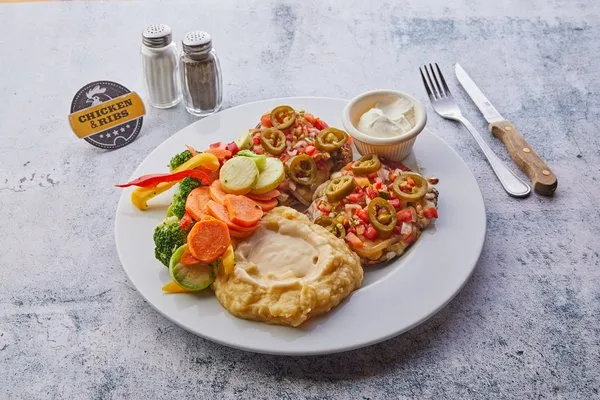 Flame grilled chicken breasts, smothered with BBQ sauce and loaded with mixed cheddar cheese, bacon, sauteed onions, jalapenos, & pico de gallo, served with sour cream and 2 sides