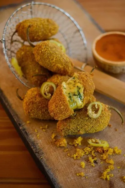 2 mozzarella sticks, 4 Chickinn nuggets, 2 fried jalapeno cheese, 2 grilled wings, potato wedges