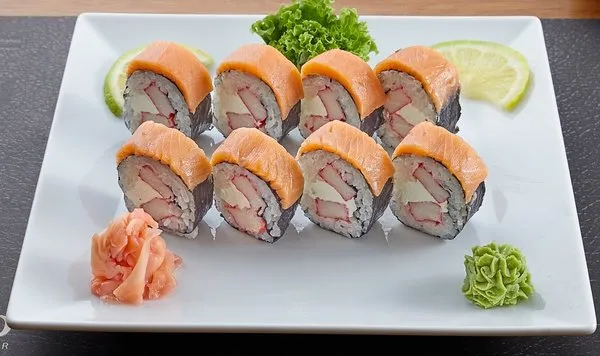 Ura style rolls topped with large single pieces of fish